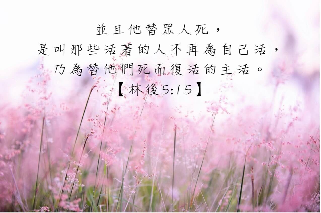 「原來基督的愛激勵我們;因我們這樣斷定,一人既替眾人死了,眾人就都死了。並且他替眾人死,是叫那些活著的人不再為自己活,乃為替他們死而復活的主活。」(哥林多後書 5:14-15)